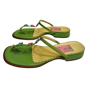 LILLY PULITZER Leather Floral Thong Heeled Sandals, Size 7 M, Green/Yell…