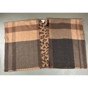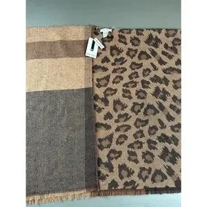 Nine West Reversible Wrap Scarf Plaid Leopard Brown Black Fringe NWT $50 MSRP
