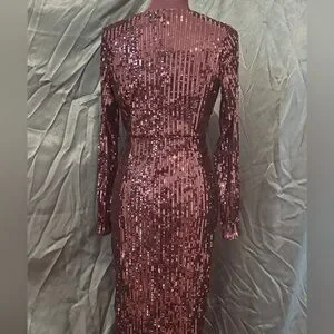 Stunning long sleeve gown adorned with shimmering sequins, ideal for formal or cocktail events. Surplice neckline and faux wrap skirt creates a leg-bearing high low effect. Fully lined and zips up the back.