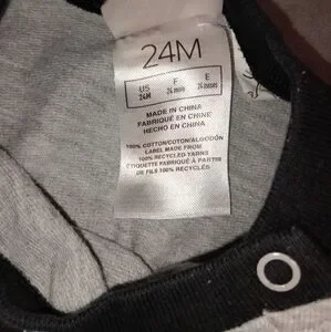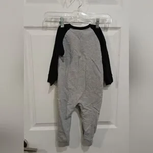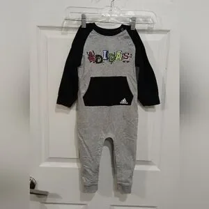 Adidas one piece with playful multicolor logo. Black sleeves and gray body. Cozy and stylish for kids.