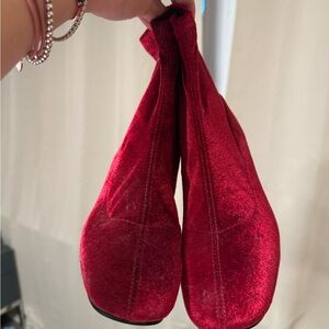 Stylish red velvet ankle boots with a block heel. Perfect for adding a pop of color to any outfit.
