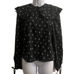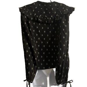 Universal Thread women's black blouse with a delicate white floral print. This top features a statement eyelet lace collar with ruffle trim and a button-up front. The long sleeves are finished with adjustable tie cuffs. Perfect for a casual day out or a romantic brunch.