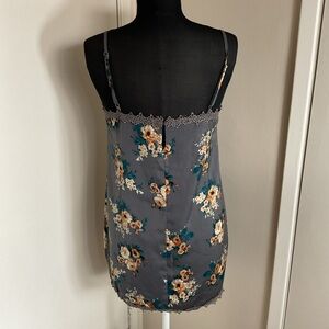 This elegant slip dress by Honey Punch features a sleeveless design with spaghetti straps, perfect for a night out. The dress showcases a sophisticated floral pattern in orange and white against a dark gray background, complemented by green foliage accents. Its mini length and fitted silhouette offer a chic and modern look.
