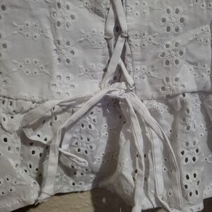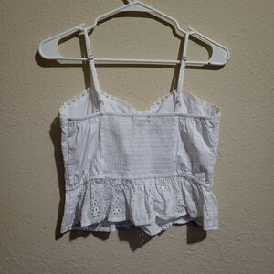 Elegant white crop top with eyelet design. Features adjustable straps and ruffle hem. In preloved condition.
