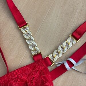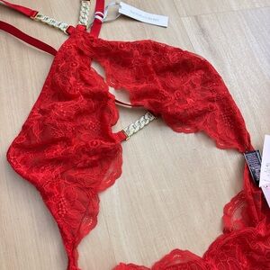 Stunning red lace bodysuit with delicate detailing. Ideal for special occasions. Features adjustable straps for comfort.