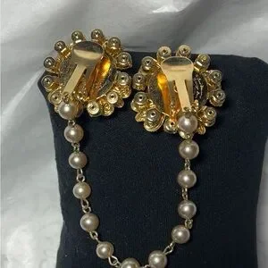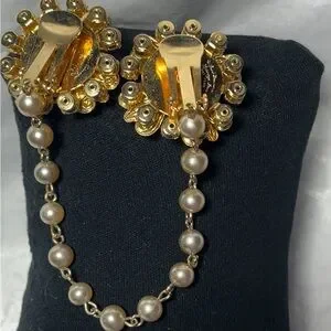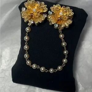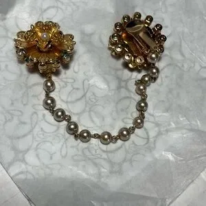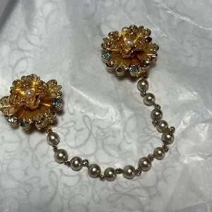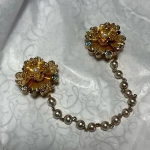 Elegant Gold Color Floral Pearl Chain Brooch Clip for sweater, shawl or cape