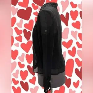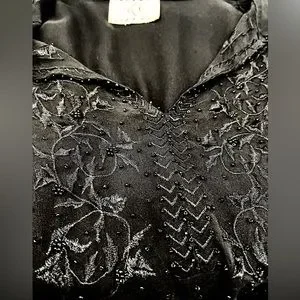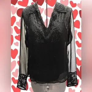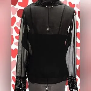 Party ready, or wear it with blue jeans and boots, this is a very cute and sexy top. The sheer fabric has embroidery and beads at the collar and bib and the cuffed button-up sleeves. The remainder of the front has scattered beads over the sheer fabric. Hand wash, in cold water and hang to dry. The approximate flat-lay measurements are; armpit to armpit blouse 19". and camisole 18", blouse shoulder to hemline length 21.5, camisole length 20", and blouse sleeve length 23.5". The condition is excellent. From a smoke-free environment.