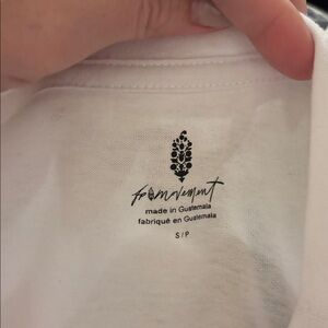 White t-shirt with colorful ski-themed graphics. Features skis, trees, and winter gear illustrations. Logo at checkmate and bottom hem. Raw hemline which is shorter in the front. See photo. This tee is oversized.