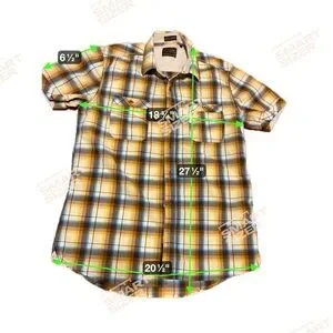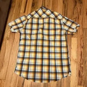 Men’s plaid short sleeve shirt with button front and dual chest pockets. Soft, lightweight fabric — perfect for casual or western wear. Great condition.