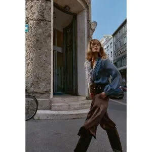High-waist trousers with darts and front pockets. Blouson leg finished in a cuffed hem with pleats. Front fastening with zip, inside button and hook.