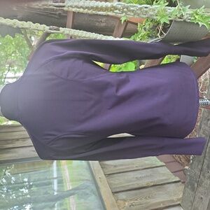 Women's purple activewear top with mock neck collar that unzips on one side. Fitted through the body and bells out at hem. Ribbing accent throughout. Thumb holes. Stretchy. Size small. Good pre-owned condition.