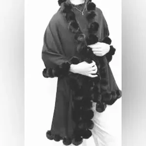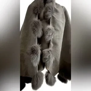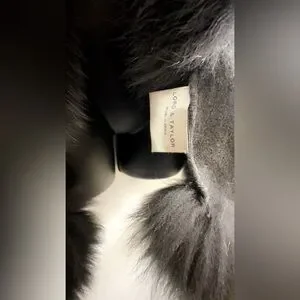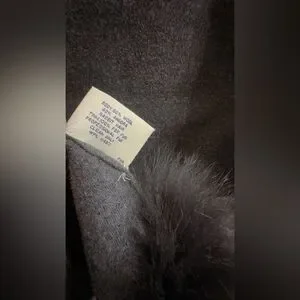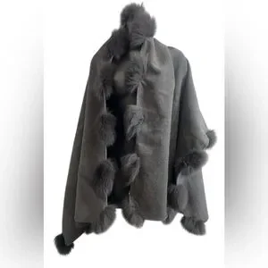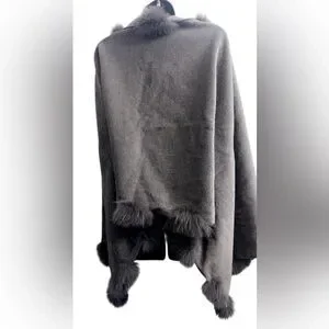 LORD & TAYLOR Plush Fox Trimmed Wrap - Grey 25” x 72” Approximately.. Elegant gray wool coat featuring a luxurious fur trim. Perfect for a sophisticated look.. BODY 100% Wool 40% Angora/Rabbit Hair, Trim 100% Fox Fur Excellent Condition.. First photo for reference only!!