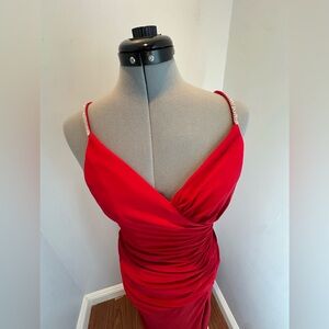 Bold red maxi dress with a sleek silhouette. Features a flattering ruched design and elegant slit. Perfect for evening events.