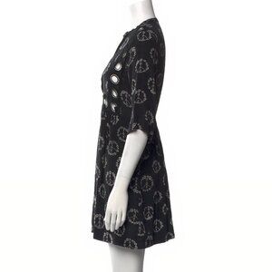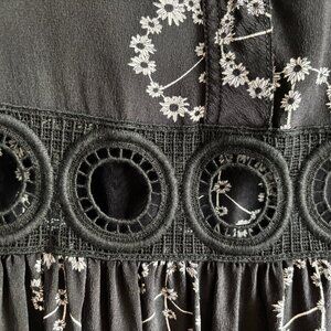 Beautiful black and white silk mini dress from French label Sandro. Features a peace sign and daisy print, with openwork embroidery above the waist and along the bodice sides.