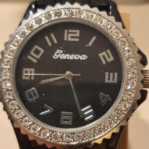 10/$20 Geneva Silver/Black Rhinestone Silicone Women's Watch