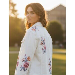 The DG2 Denim Jacket by Diane Gilman is a stylish and comfortable addition to any woman's wardrobe. Made from a cotton blend denim fabric, this jacket features a button closure, a collared neckline, and soft, fringed accents. The bohemian floral pattern adds a touch of Western flair, making it perfect for casual, party, or workwear occasions. With its relaxed fit and long sleeves, this jacket is versatile for all seasons and can be machine washed for easy care. Upgrade your outerwear with this trendy and designer piece from DG2 by Diane Gilman.
