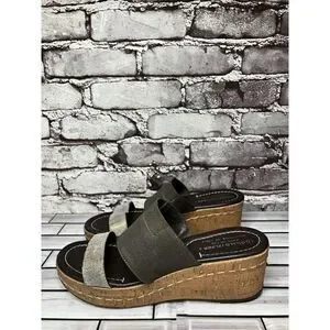 Elevate your shoe game with these stunning Donald Pliner Shera Copper Metallic Straps Cork Wedge Sandals. Slip into comfort and style with these mid-heel height wedges that feature a unique metallic mesh elastic upper material. The sandals are perfect for any occasion, whether it's for travel, party, or casual wear.