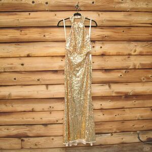 Expertly crafted with a high neck halter design and stunning sequin fabric, this sleeveless gown is a must-have for any formal occasion. Its open back adds a touch of elegance, perfect for making a statement.