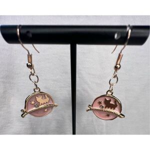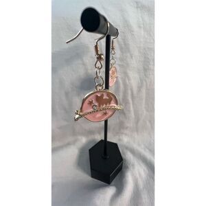Handmade Pink Circular Cat On A Branch Earrings With Jewel