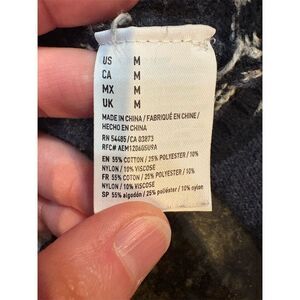 This American Eagle men's medium pullover sweater features a geometric pattern in navy and white. Made from a blend of cotton, polyester, nylon, and viscose, it is designed for casual occasions and is ideal for fall. The sweater includes a hood and a button-up front, with long sleeves for added warmth. It is machine washable for easy care. The pit-to-pit measurement is 22 inches. This pre-owned item shows signs of wear and could benefit from a good shaving.