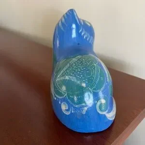 Vintage talavera blue lounging cat figure from Mexico. No chips or cracks but I cannot tell if it is a glaze chip on the ear or if a drop of black paint landed on it. It’s hard to tell