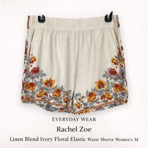 Rachel Zoe shorts, linen blend shorts, ivory shorts, floral border shorts, elastic waist shorts, women’s summer shorts, casual shorts, pull on shorts, vacation shorts, breathable linen shorts, size medium shorts, everyday wear, lightweight summer shorts