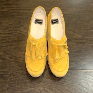 Chic mustard suede loafers with tassel accents. Features a sturdy block heel.