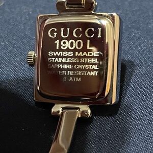 Chic authentic Gucci watch with a sleek square design. Silver stainless steel frame and black face with sapphire crystal . Ideal for stylish wear. 1900L series, approximately 16cm wrist size, approximately 20mm case diameter . Is in mint condition, practically new. . Comes with generic watch box . Gorgeous!