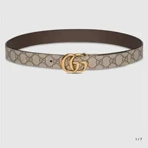 Elegant Gucci belt featuring a gold buckle. Stylish brown strap with signature design.