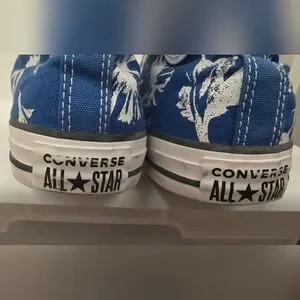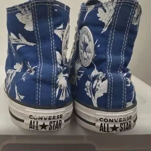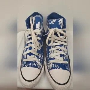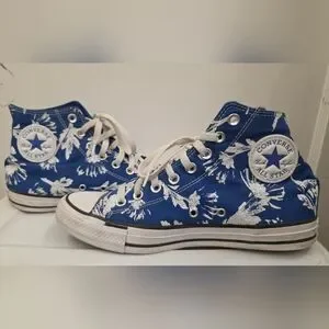 Stylish high-top sneakers with a floral pattern. Features a blue canvas with white floral design. Classic Converse style.