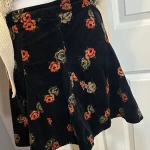 Elegant fit and flare skirt with floral design size 8. Button and zip closure. Features a black base with red and tan flowers. Ideal for versatile styling. Free People for Urban Outfitters