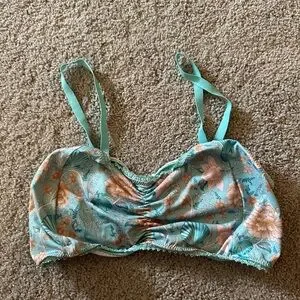 Charming blue bra with floral design. Features delicate lace trim. Comfortable and stylish.