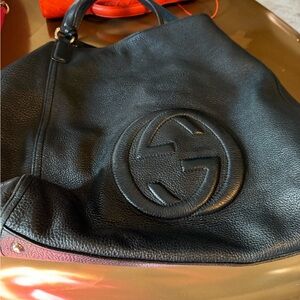Chic black leather shoulder bag with iconic embossed logo. Pebbles leather. Very large and Ideal for daily wear. Wear on the handle but it’s minor. Missing long cross body strap