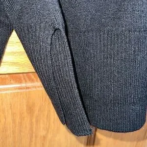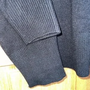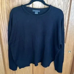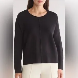 Black sweater with center seam. Slight rolled neck. Ribbed cuffs and hem. Side slits. Oversized fit with drop shoulders. Size small. Bust measures approximately 24 inches and length is approximately 23 inches.
