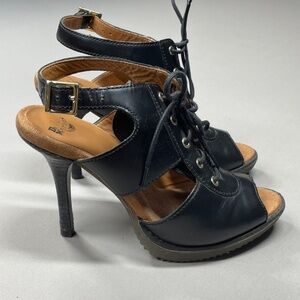 Stylish black heeled sandals. Open-toe design with lace-up front. Adjustable ankle strap for secure fit. Perfect for any occasion.