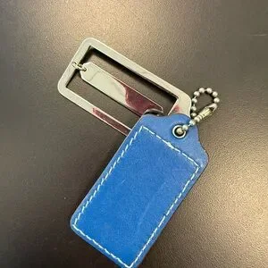 Elegant Coach keychain with blue leather and silver metal accents. Perfect for adding style to your keys.