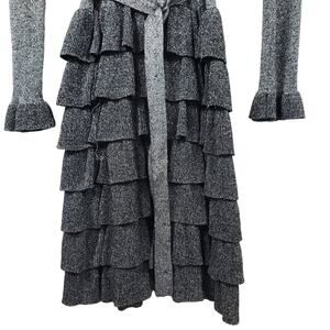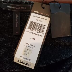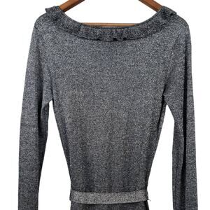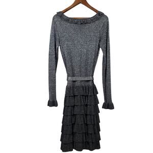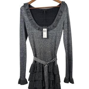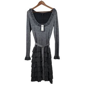 NEW! BCBG Maxazria Cassie Dress - M new with tags. Silver and black. Ruffled scoop neck, long sleeve. Tied belt, ruffled skirt.
