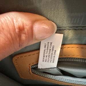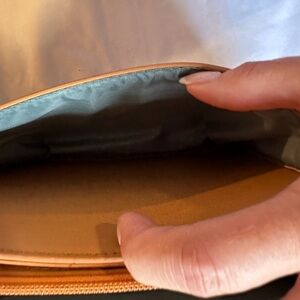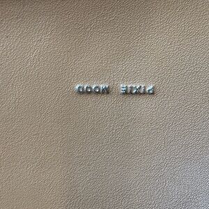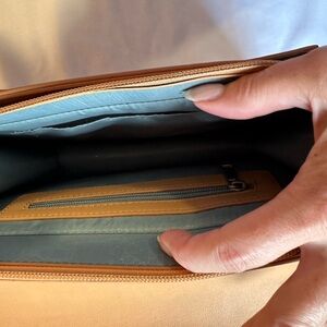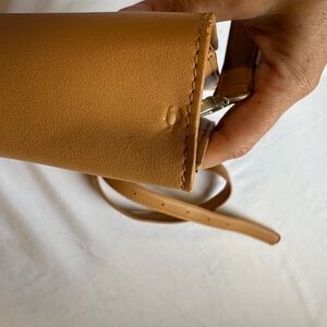This camel color crossbody bag features a minimalist design with a smooth leather finish and an adjustable strap for versatile wear. Its structured shape and flap closure offer a timeless look, making it a perfect everyday accessory. Never used but has two indentations on top (in pictures) from the detachable strap hook. Strap can be swapped out since it is detachable. Liner is made from recycled water bottles. Has a magnetic snap closure.