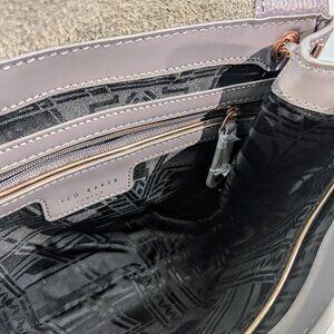 This elegant Ted Baker London handbag is made from soft, pebbled leather grey mauve/taupe purple hue. The bag features a classic flap-over design that secures with a magnetic snap closure. A prominent design element is the polished rose gold-toned metallic bar centrally placed on the flap, delicately engraved with the "TED BAKER LONDON" logo, adding a signature touch. The bag is carried by a rose gold-toned chainn and leather-interwoven strap. The interior is well-organized, featuring multiple compartments and pockets (as suggested by the structure and a glimpse into the lining), with a suede lining that is characteristic of Ted Baker's attention to detail. The overall design balances classic elegance with contemporary rose gold hardware, making it suitable for both casual and more dressed-up occasions.