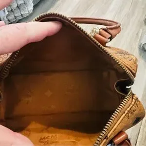 Elegant MCM leather satchel in cognac. Features iconic logo pattern. Gold hardware adds a touch of luxury. Vintage made in Germany.