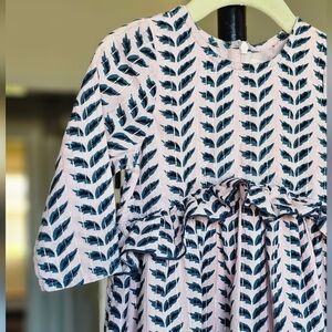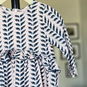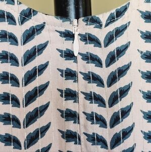 Pale pink and teal crystal rose leaf pattern dress with soft, dainty metallic pin stripes and a cute, arced waist ruffle.