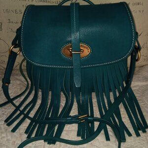 Pretty smooth leather teal leather bag with long leather fringe, and gold logo plate accents on front. Leather handle and snap pocket on back. Inside is suede lined with on open pocket on one side. Adjustable shoulder/crossbody strap with 23" drop. 9"w., 9"tall, 3"deep.Good pre owned condition. It does have faint edge wear & does have a faint dark streak on back (see pic) that camera picked up, but is hardly noticeable in regular light. Retail 395.