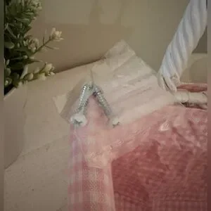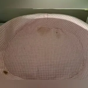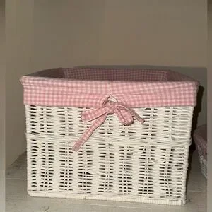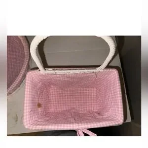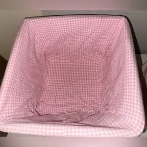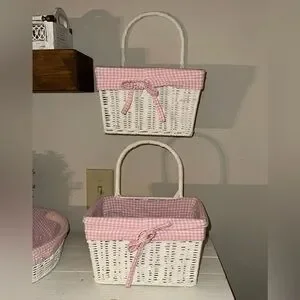 Hard to find adorable Pottery Barn Kids (PBK) Basket Set with pink and white gingham liners. Can be used with or without the liners. The baskets are very heavy duty and in perfect condition. The liners have some marks on the inside but cannot be seen when displayed (I have shown all marks in the close-up inner pictures). Included are the original un-opened hanging basket fasteners (I used other existing ones) as well as 2 curtain pull-backs that went with the set. Approx. Dimensions are: