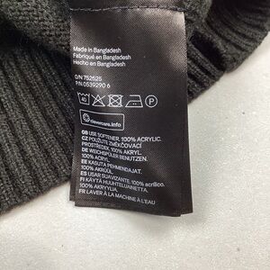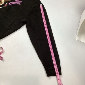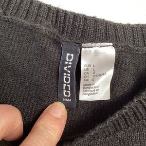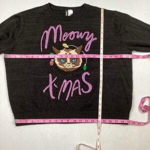 Divided Ugly Christmas Sweater Meowy X-Mas. Size Large. Color is black with colorful embroidered cat face, Christmas lights and “Meowy X-Mas’ on front. Pullover design. Excellent condition.