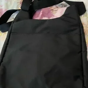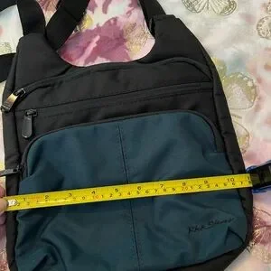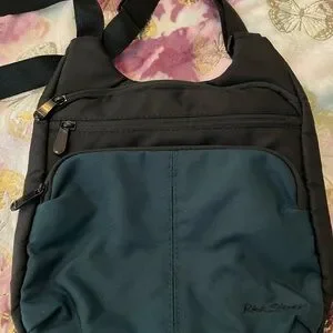 Rick Steves travel crossbody bag. Featuring a sleek black and teal design, this bag is perfect for travel and daily use. Durable and versatile, it complements any outfit. Ideal for sightseeing.