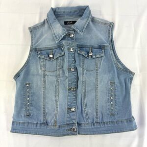Stylish light blue denim vest. Features button closure. Embellished with studs.