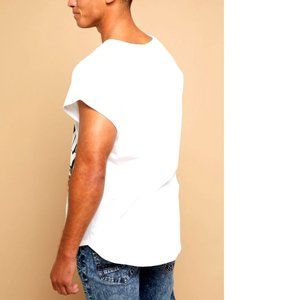 This white cotton muscle tee is outfitted with a ribbed knit crew neckline, round hem, and Bob Marley and The Wailers Tour 1979 screen print on the front. Runs bigger, check measurements. 100% Cotton.