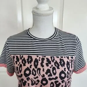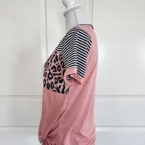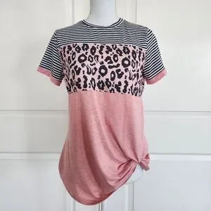 The Camisa Women's Leapard Striped T-shirt in pink, white, and black is a stylish comfortable casual top. The animal pattern adds a fun and trendy touch, perfect for the summer, fall, or spring seasons.