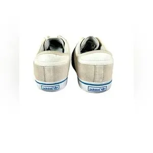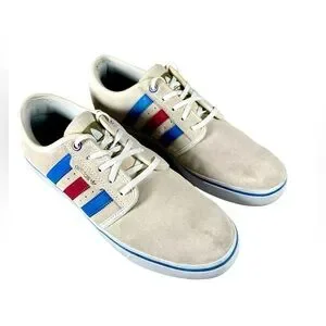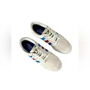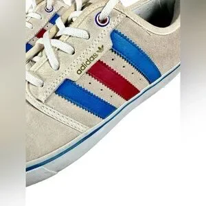 Cream sneakers with vibrant blue and red stripes. Classic Adidas style.