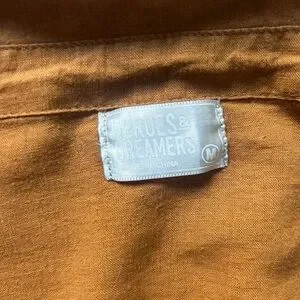 This Heroes & Dreamers rust brown button-down blouse features a relaxed fit with 3/4 puff sleeves and gentle elastic cuffs. The lightweight linen-blend fabric drapes beautifully and gives a natural, breathable texture — perfect for layering or wearing on its own.